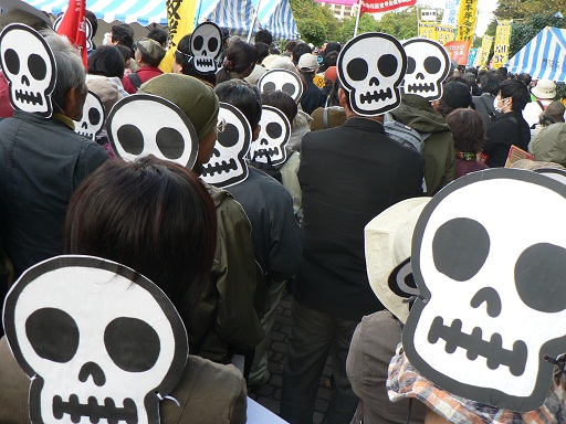 今日は「さよなら原発北海道1万人集会」でした。8丁目広場には、9丁目のモニュメントにまで人があふれ、12000人が集まりました。これほどの大きな集会は初めてでした。各地の反原発の運動の報告や、呼びかけ人となった、倉本聡さんや雨宮処凛さんの訴えなど、集会としても1時間を越えましたが、ステージの発言にみなさんが真剣に耳を傾けていました。デモも2コースに分かれましたが、私が歩き終わって、大通り公園にもどってきても、まだ出発していないグループがいました。帰りの車の中で、デモ行進のため、市内の交通障害について、ニュースが流れていました。テレビカメラもたくさん来ていました。厚別からは、また、骸骨のお面を用意していきました。