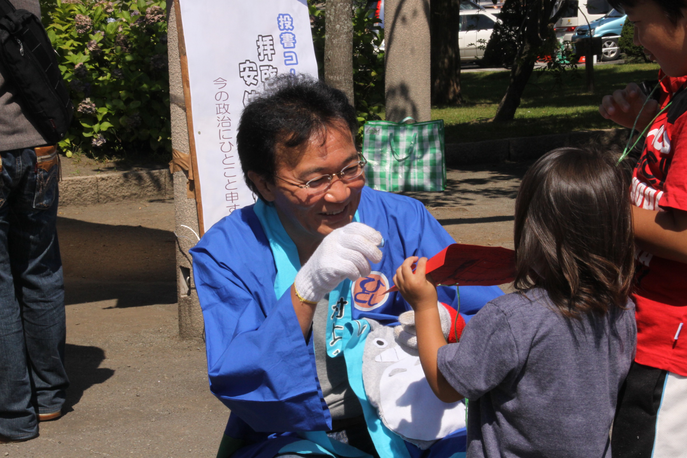 8月31日(日)日本共産党札幌白石・厚別地区委員会と両区の後援会共催の第14回ふれあい祭りが開かれました。厚別区では、村上ひとし市政事務所が「やきとり・ぴとちゃん」を出店したのをはじめ、各後援会がビールややきそば、お汁粉、綿菓子などの模擬店で参加者1100人の市民と触れ合いました。会場内では6人の不思議なおじさんを探してスタンプをもらう「スタンプラリー」で、トトロのおじさんに扮した村上に子ども達やその親御さんたちが駆け寄ったり、ヘリウム風船やヨーヨーを手にうれしそうに走り回るたくさんの子ども達の姿が見られました。